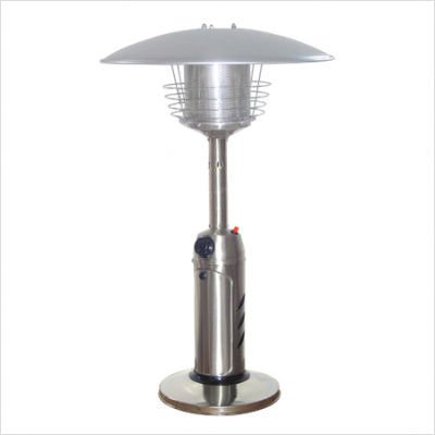 Finish:Stainless Steel Outdoor Tabletop Propane Patio Heater Weight plate for added stability Thermocouple and Anti-Tilt safety devices Easy start ignition Burner screen guard Uses a 1lb propane tank (not included) Burner cover included Heat production of 11K BTU's which heats a 6 ft diameter